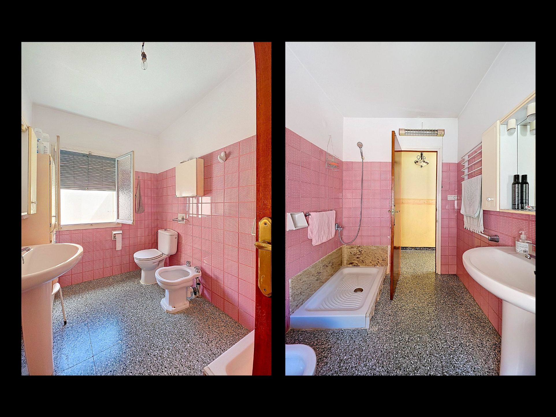 From one entrance, the house is on street level, while the living area is reached via a staircase from the other street. On the ground floor, there is a very large garage with enough space for five cars. The garage also has two separate rooms, ideal for use as storage or a workshop. It also offers the possibility of converting one space into a bedroom and using the rest of the large area as a guest suite or home office. From the garage, you can access the spacious patio, which also includes a small toilet. The patio is partially covered, providing a perfect spot for creating an outdoor kitchen or even installing a jacuzzi. Let the Spanish sun come!