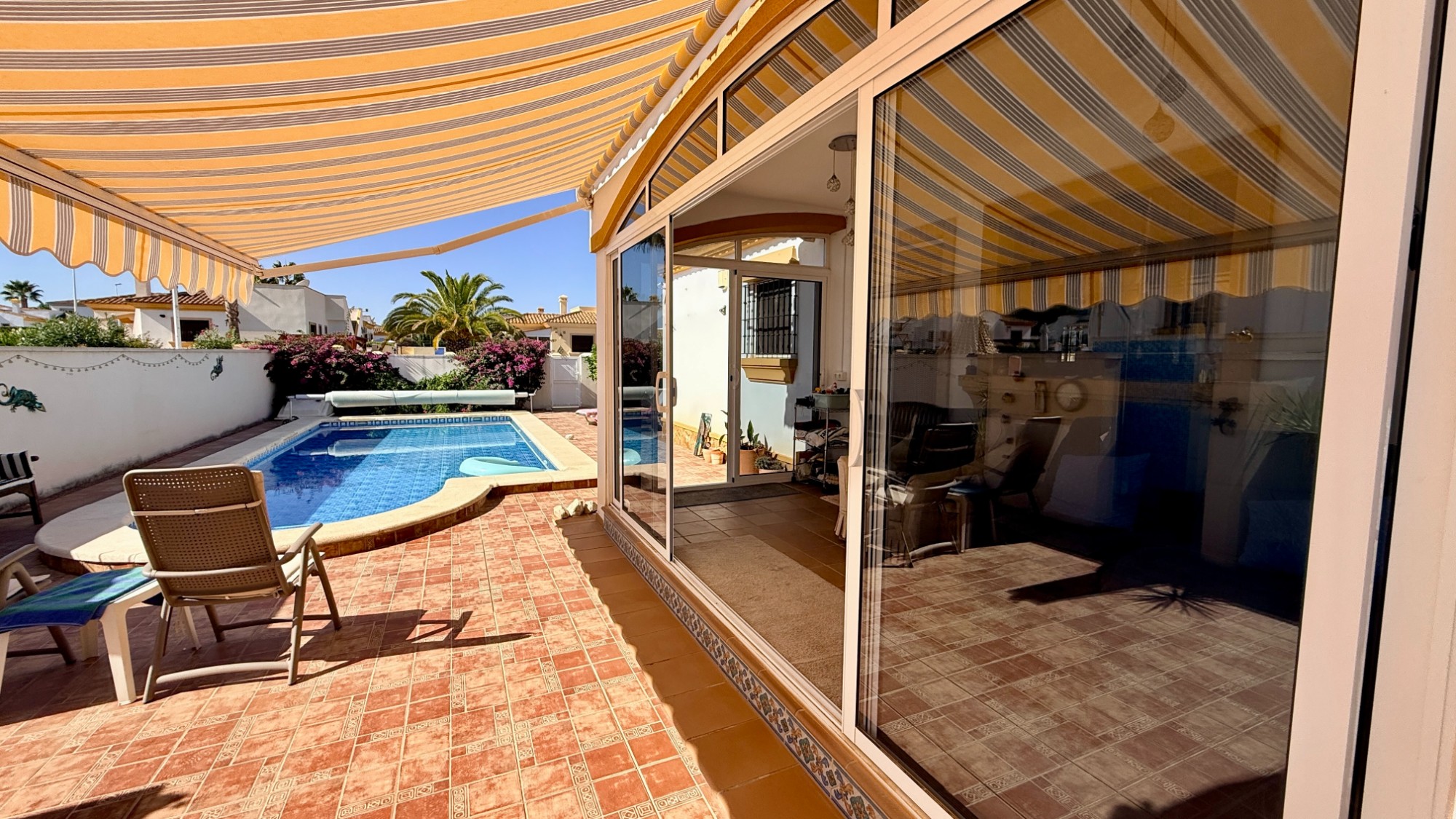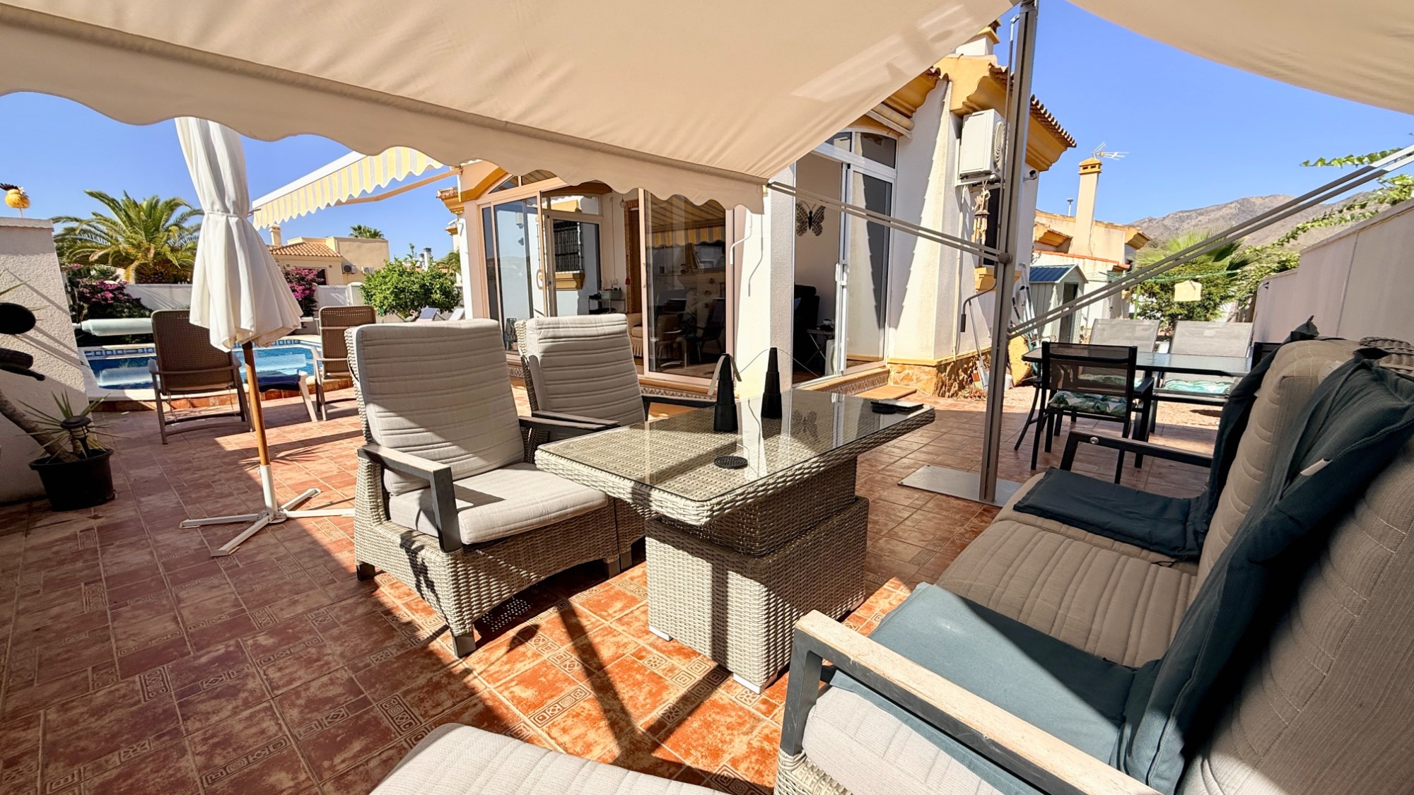 The villa has been lovingly used as a holiday getaway and is now offered for sale unfurnished as the owners are upsizing for full-time living. The property is perfectly positioned on its plot, with a raised glazed porch overlooking the pool — an ideal spot to enjoy alfresco dining or simply watch the sun move across the sky on the 300+ sunny days each year.