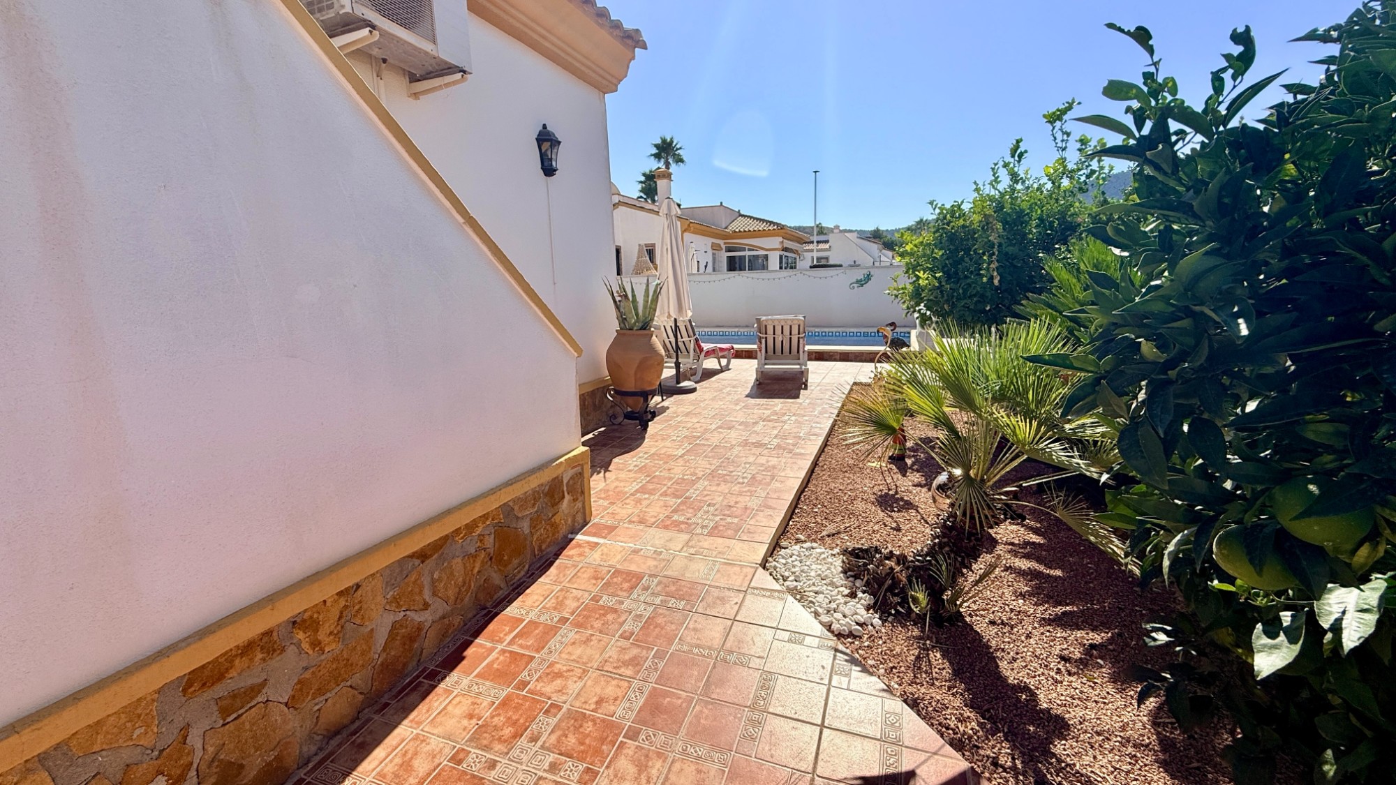 The recently renovated private pool forms the centrepiece of the garden, surrounded by a generous sun terrace that enjoys sunshine from dawn until dusk. There’s off-road parking on the driveway, a handy storage shed, and stairs leading to a rooftop solarium — the perfect place to soak up panoramic views of the surrounding hills and mountains. You are just a couple of minutes walk from a beautiful bar, restaurant, cafe. Either Hondon Village in 5 minutes with 20+ bars, restaurants and cafes plus medical, shop, supermarkets, garages…